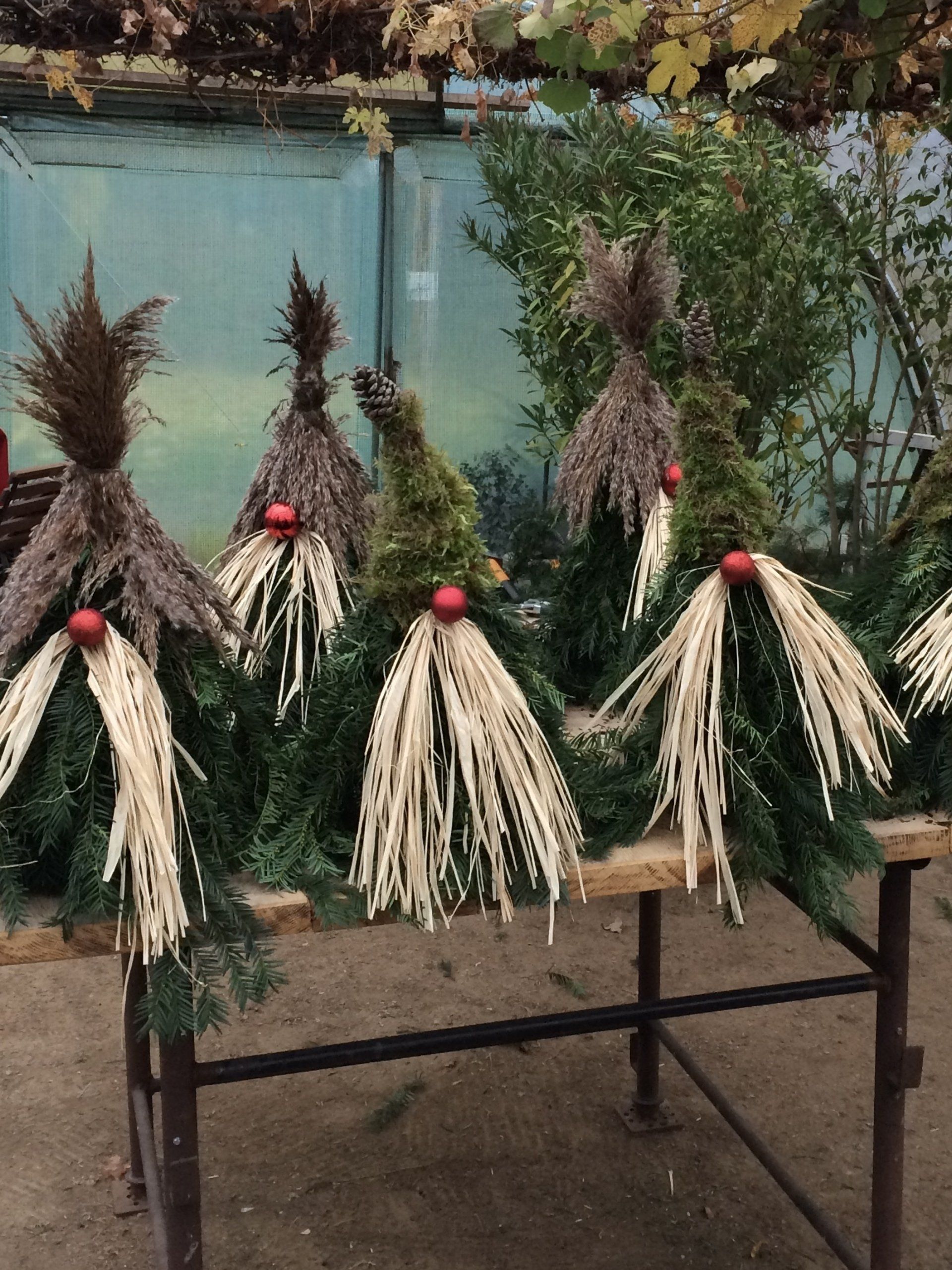 Gestalte dir einen kleinen Wichtel aus Tannenzweigen mit einer schönen roten Nase und einem lustigen Bart, oder ein Wichtelmädchen mit Zöpfen. Außerdem kannst du dir auch kleine Bäumchen mit einem schiefen Zipfel binden. Es ist auch möglich, beides zu gestalten.