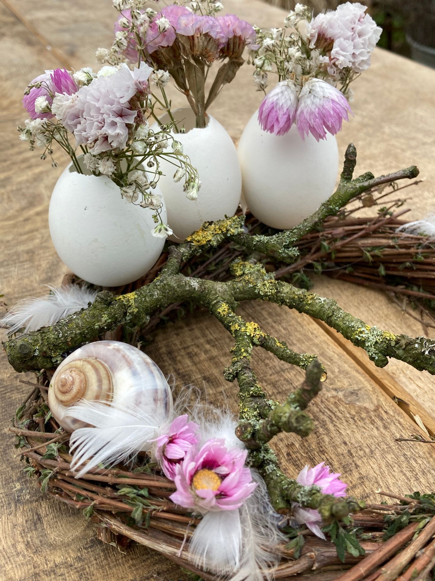 An diesem Nachmittag kannst du dir einen Osterkranz binden, ein Osternest, oder eine florale Osterdekoration zum hinstellen gestalten. Die Werkstücke werden mit Blumen, Buchsbaum, Zweigen, Moos, Heu, Gräsern, verschiedenen Eiern, Federn und anderen Naturmaterialen dekoriert.