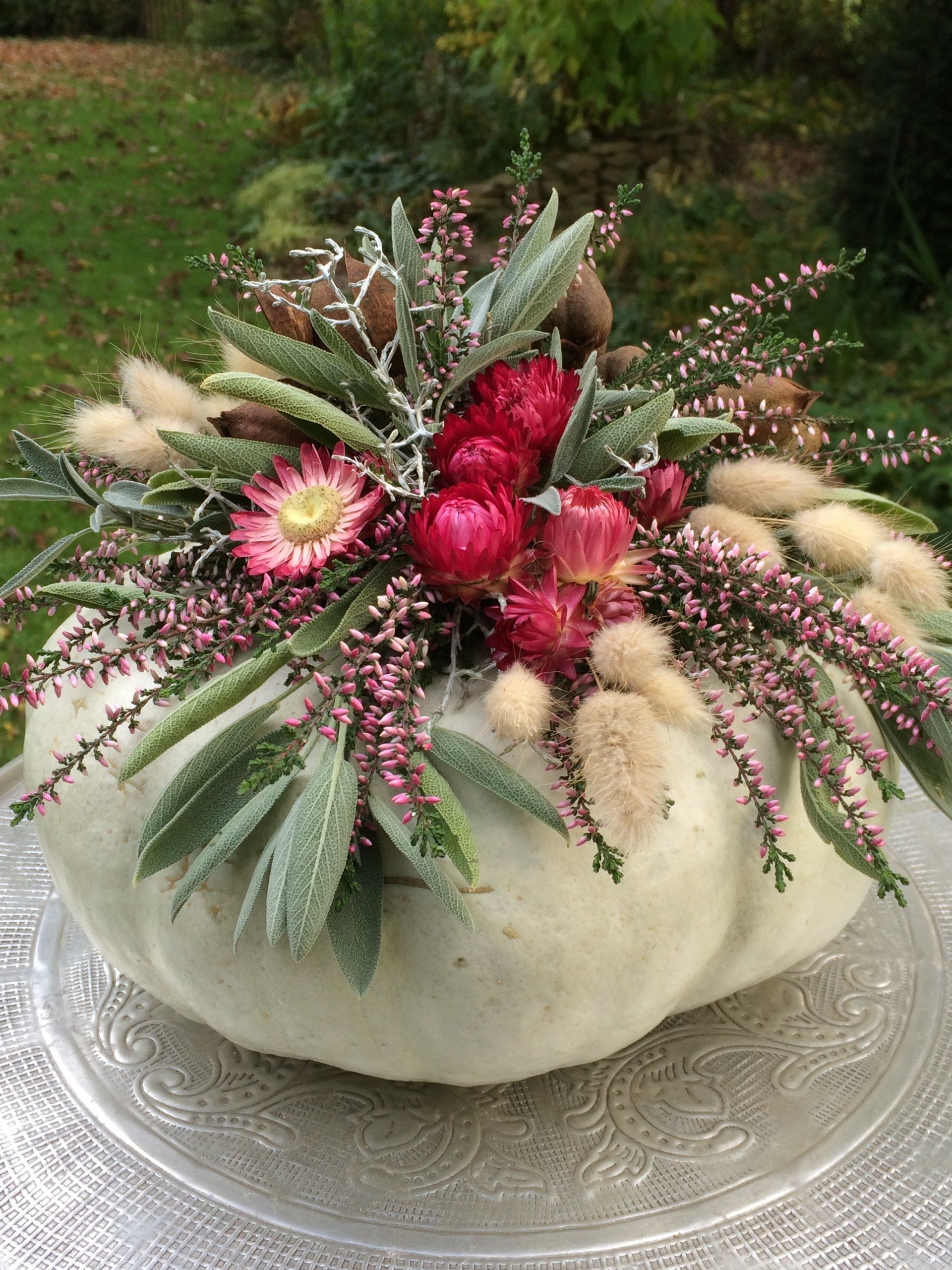 In diesem Kurs kannst du dir Kürbisse gestalten. Die Kürbisse werden mit Trockenblumen und anderen herbstlichen Naturmaterialen dekoriert. Die Kürbisse werden nicht ausgehöhlt, sondern die Deko wird auf Ihnen befestigt, so dass du lange daran Freude hast. Zusätzlich kannst du noch eine kleine Dekoration zum aufhängen gestalten.