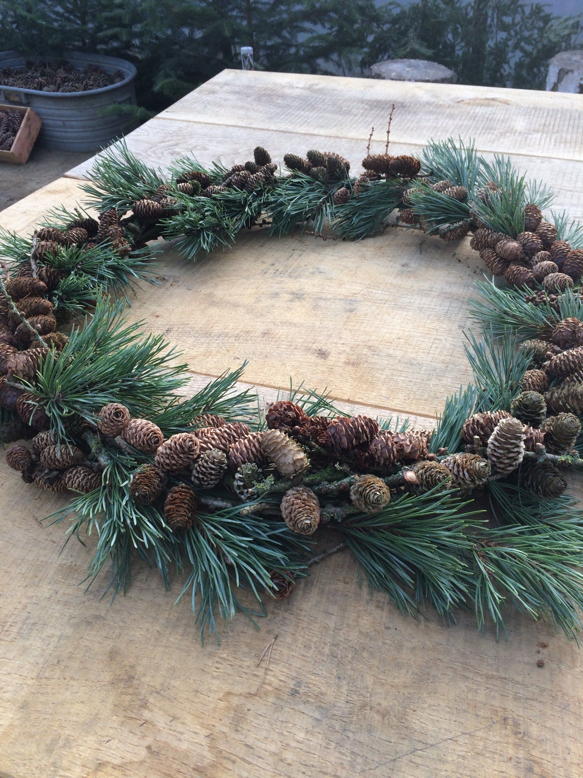 Gestalte dir einen Kranz aus frischem Tannengrün, Zapfen, Naturmaterialen, Bändern und mehr. Es stehen verschiedene Sorten Tannengrün, Koniferen, Ilex und Kiefer zur Verfügung.