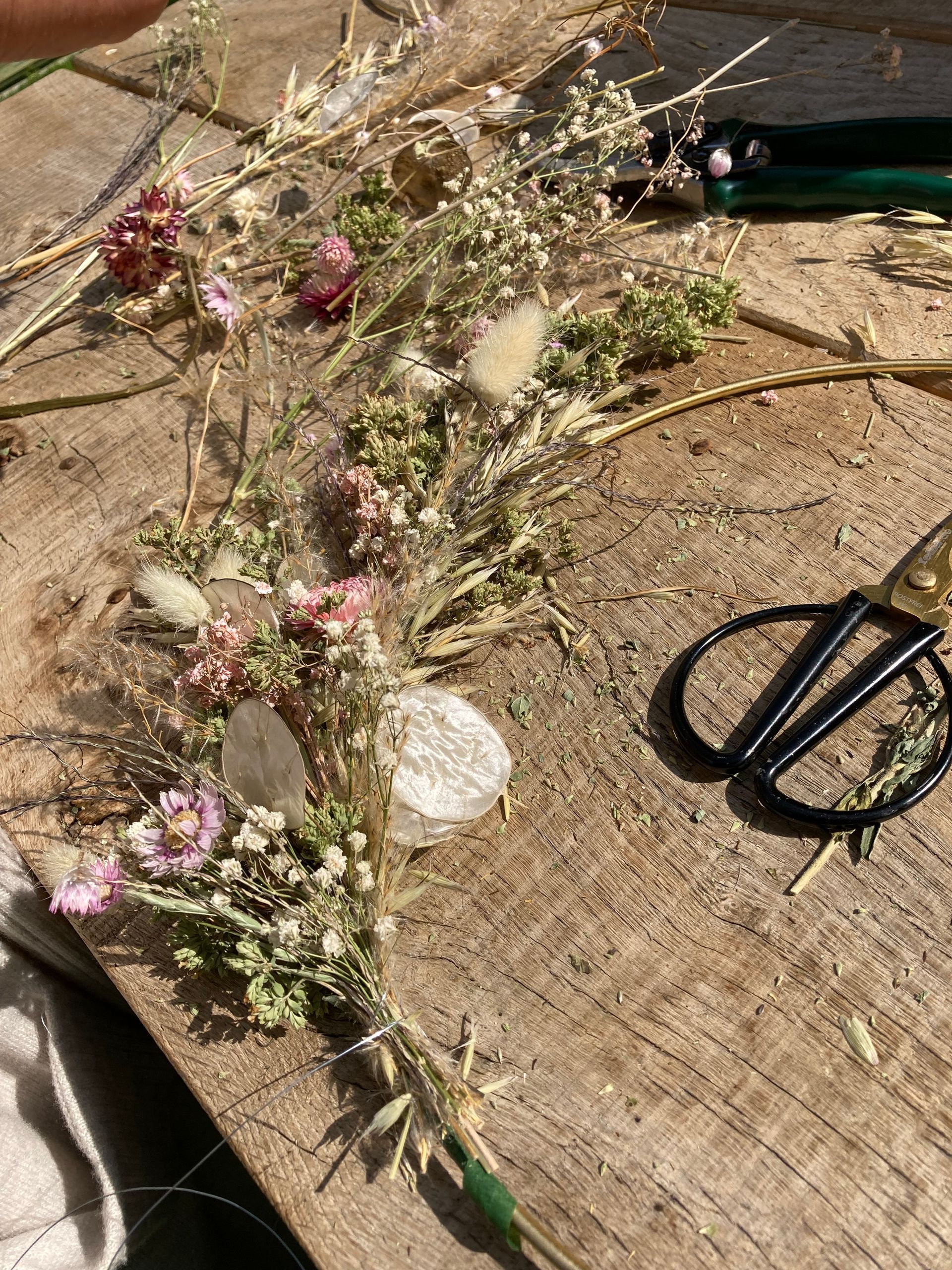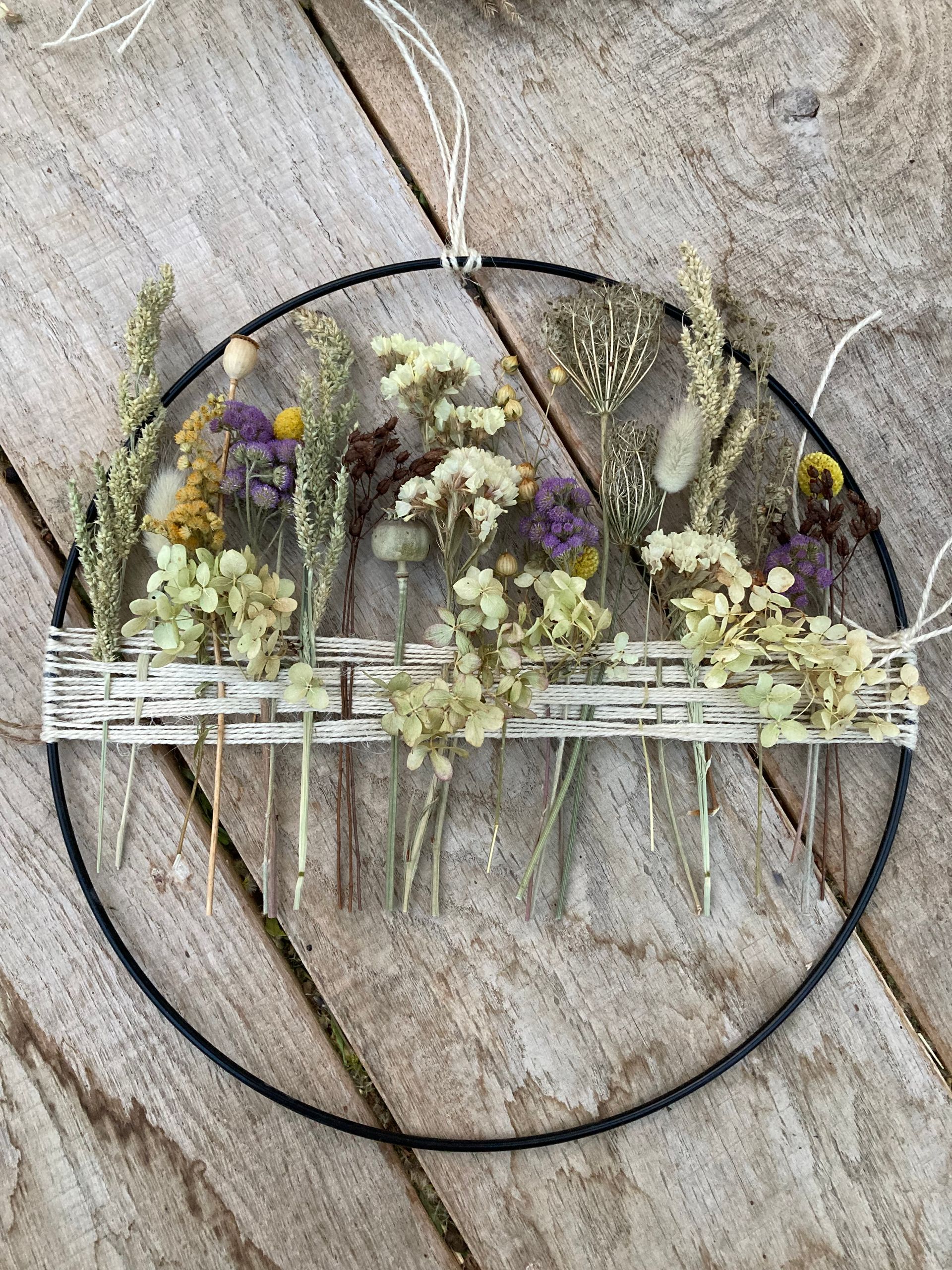 Bei diesem Kurs werden Kränze auf einem Metall- oder Holzreifen gestaltet. Verwendet werden getrocknete Blumen und Gräser aus eigenem Anbau. Die Metallringe stehen in unterschiedlichen Farben zur Verfügung.